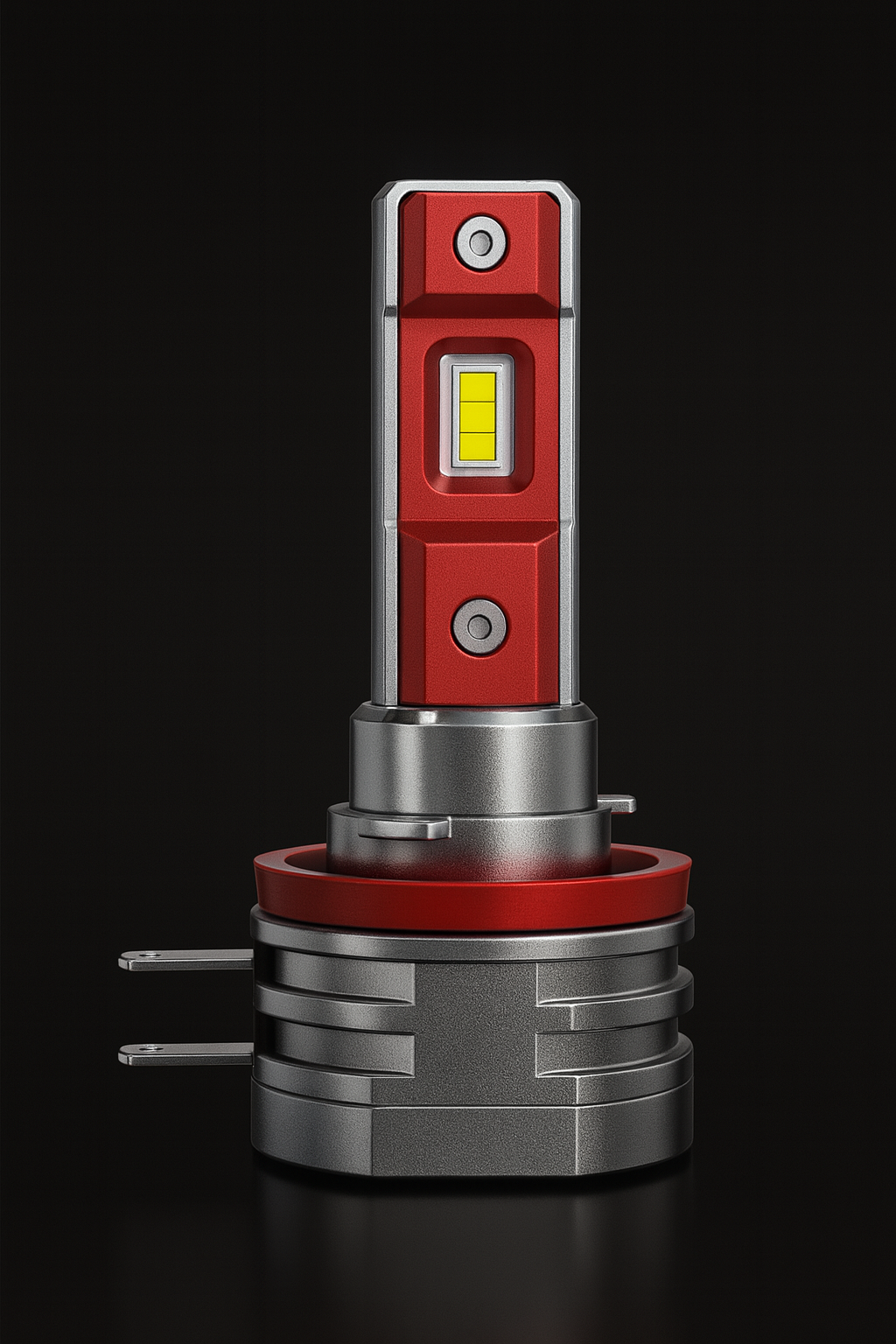 Cette ampoule de performance automobile présente un design contrasté entre une tête rouge anodisée et une base en chrome poli.